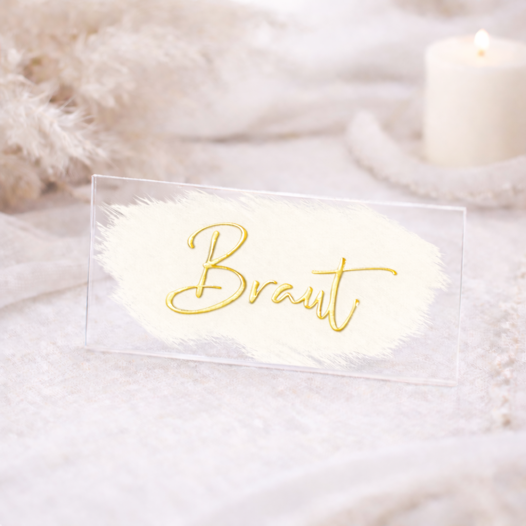 Jede rechteckige Platzkarte (9x5 cm) wird von Hand in deiner Wunschfarbe bemalt und anschließend mit glänzender Goldschrift personalisiert. Durch die Kombination aus transparentem Acryl, feinem Pinselstrich und schimmernder Schrift entsteht eine hochwertige, zeitlose Tischdekoration.